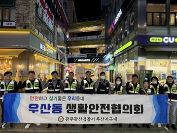 광주광산경찰서(서장 김철우) 우산지구대에서는 28일 오후 7시부터 지역주민 17명으로 구성된 우산생활안전협의회(월1회 합동순찰) 회원들과 함께 APEC 국제행사를 앞두고 유동인구가 많은 우산동 먹자골목 일대에서 기초질서 준수 홍보 등 합동순찰을 실시했다.이날 합동순찰은
