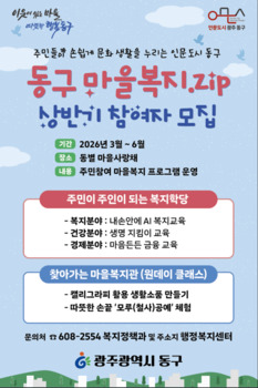 광주 동구는 주민 누구나 일상에서 복지를 배우고 참여할 수 있는 ‘동구 마을복지.ZIP’사업을 오는 3월부터 본격 추진한다.‘마을복지.ZIP’은 주민이 생활 속에서 자연스럽게 복지를 배우고 이웃과 소통하며 정이 넘치는 마을공동체를 만들기 위한 광주 동구의 대표