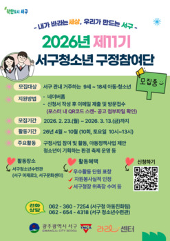 광주 서구(구청장 김이강)는 미래를 이끌어갈 청소년의 목소리를 지역정책에 적극 반영하기 위해 초·중·고등학생들이 행정의 주체로 참여해 지역문제를 살피고 정책을 직접 제안하는 ‘제11기 청소년구정참여단’을 본격 운영한다.청소년구정참여단은 광주 서구의 대표적인 청소년 참여