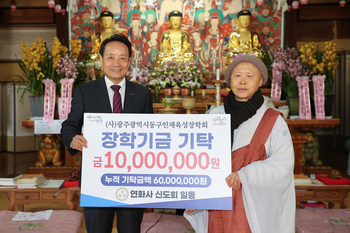 광주 동구는 지난 25일 연화사(주지 명신 스님) 법당에서 동구 인재육성장학회에 장학금 1000만 원을 기탁받았다고 밝혔다.이번 기탁으로 연화사는 지난 2021년부터 올해까지 6년간 매년 1000만 원씩, 총 6000만 원의 장학금을 후원하게 됐다. 꾸준한 나눔을 통해