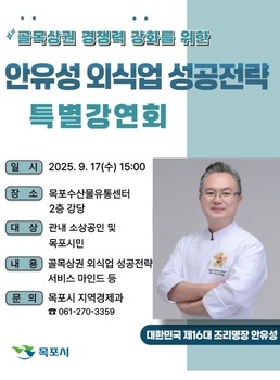 목포시는 골목상권의 경쟁력 강화를 위해 오는 17일 오후 3시 목포수산물유통센터에서 대한민국 제16대 조리명장 안유성을 초청해 특별강연회를 연다.이번 강연은 소상공인들에게 실질적인 경영 노하우와 서비스 역량 강화를 위한 경험을 전하기 위해 마련됐다. 안 명장은