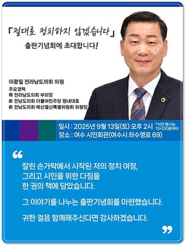 이광일 전남도의회 부의장이 13일 오후 2시 여수시민회관에서 저서 '절대로 정치하지 않겠습니다' 출판기념회를 개최한다.이 부의장은 내년 6월3일 개최되는 제9회 전국동시지방선거에서 여수시장 출마가 거론되는 상황이어서 이번 출판회에 지역 정가의 관심이 쏠리는 모습이다.&