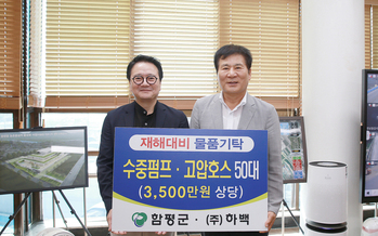 ㈜하백(대표 김대인)은 재난으로 어려움을 겪는 군민들을 돕기 위해 함평군(군수 이상익)에 수중펌프 등 재해 대비 물품을 기탁했다.함평군은 11일 “㈜하백이 지난 10일 수중펌프·고압호스·원터치커플링 각 50대씩, 총 3500만 원 상당의 물품을 기탁했다”고 밝혔다.기탁