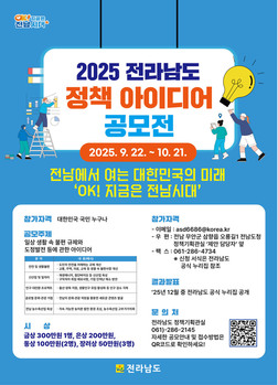 전남도가 새 정부의 실용주의 기조에 맞춰 ‘생활 속 불편을 찾고 이를 개선할, 지역의 미래를 먹여 살릴 정책’을 주제로 ‘2025년 전라남도 정책 아이디어 공모전’을 개최한다.공모전은 대한민국 국민이라면 누구나 참여할 수 있다. 응모 기간은 오는 21일까지다.분야는 △
