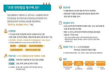 전남도는 각종 재난으로부터 도민의 생명과 재산을 보호하고 일상 생활주변에 불안전한 위험요소를 찾아 무료로 안전점검하는 ‘도민 안전점검 청구제’를 운영하고 있다고 밝혔다.도민 안전점검 청구제는 도민 누구나 주변 시설이나 구조물 등 위험 요소를 발견했을 경우 해당 시설에