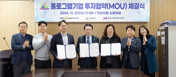 홀로그램 선도도시 익산시가 독보적 기술을 가진 국내 기업 '홀로그래미카'와 손을 맞잡았다.익산시는 27일 시장실에서 정헌율 익산시장을 비롯해 박창준 홀로그래미카 대표, 김수영 홀로그램콘텐츠서비스센터장 등 관계자들이 참석한 가운데 투자협약을 체결했다.협약에 따라 홀로그래