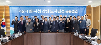 익산시 노사민정협의회가 지역기업과 함께 원·하청 상생을 기반으로 지역경제 위기를 돌파한다.익산시는 22일 시청 대회의실에서 노사민정협의회를 개최하고 주요 기업과 함께 '익산시 원·하청 상생 노사민정 공동선언문'을 채택했다.이날 회의에는 정헌율 익산시장을 비롯한 노·사·