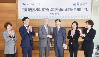 김관영 전북특별자치도지사는 4일 세계 1위 글로벌 수탁은행인 BNY멜론의 하니 카블라위(Hani Kablawi) 국제부문 대표와 팡팡 첸(Fangfang Chen) 아시아태평양 대표를 면담하고 전북자치도의 금융산업 발전을 위해 함께 노력해줄 것을 당부했다.BNY멜론은