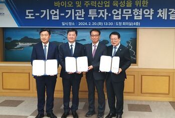전북 익산시가 천연물 기반 바이오 앵커기업 ㈜제이비케이랩과 투자협약을 체결하며 바이오 산업 도시로서 입지를 굳히고 있다.20일 시에 따르면 도청 회의실에서 김관영 도지사와 정헌율 익산시장, 장봉근 ㈜제이비케이랩 대표이사 등이 참석한 가운데 익산 제3일반산업단지 내 투자