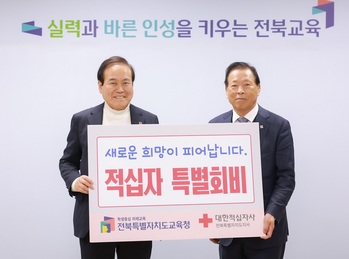 전북특별자치도교육청은 16일 오전 11시 청사 회의실에서 대한적십자사 전북지사(회장 이선홍)에 2025년도 적십자 특별회비를 전달했다.전북교육청은 지역 내 복지 사각지대를 해소하고 각종 재난 현장에서의 긴급구호활동에 동참하기 위해 2015년 이후 매년 적십자에 특별회비