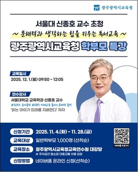 광주시교육청(교육감 이정선)은 오는 12월1일 오전 9시40분 교육연수원에서 신종호 서울대학교 교육학과 교수를 초청해 학부모 특강을 진행한다.특강은 ‘문해력과 생각하는 힘을 키우는 독서교육’을 주제로, 학부모에게 가정에서 안정적인 독서환경 조성과 문해력·사고력 향상을