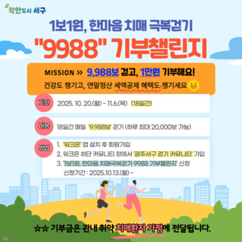 광주 서구(구청장 김이강)가 오는 20일부터 11월 6일까지 18일간, 치매 인식 개선과 기부문화 확산을 위한 ‘1보1원, 한마음 치매극복걷기 9988 기부챌린지’를 진행한다.이번 챌린지는 치매상담콜센터 홍보와 함께 주민 참여를 통해 치매 극복에 대한 지역사회의 관심을