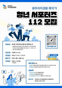 광주광역시 자치경찰위원회는 3일부터 17일까지 ‘제10기 청년 서포터즈 112’ 참여자 112명을 모집한다.‘청년 서포터즈 112’는 광주자치경찰위원회가 2021년 전국 최초로 도입한 청년 참여 프로그램으로, 청년들이 사회관계망서비스(SNS)를 활용해 자치경찰의 주요