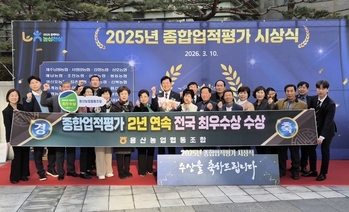 용산농협(조합장 박철환)은 지난 3월10일 농협중앙회 본부 대강당에서 열린 ‘2025년 종합업적평가 최우수 농·축협 시상식’에서 종합업적평가 최우수상 수상과 클린뱅크 금 등급을 수상하는 영예를 안았다.이로써 지난해에 이어 올해까지 2년 연속 종합업적평가 최우수상과 클린