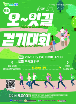 광주 서구(구청장 김이강)는 11월2일 극락교 하부(서창둑길 377) 일대에서 ‘제5회 함께 서구, 오~잇길 걷기대회’를 개최한다. ‘오잇길’은 ‘오(5)000원의 나눔으로 우리 이(2)웃의 희망을 잇는 5.2km의 길’이라는 의미로, 이번 대회는 가족돌봄청년