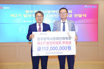 광주시(시장 강기정)는 29일 시청 비즈니스룸에서 광주시장애인체육회 제2기 발전위원회가 후원금 1억1200만원을 장애인체육회에 전달했다고 밝혔다.이날 전달식에는 광주시장애인체육회 회장인 강기정 시장을 비롯해 한상득 수석부회장, 정선교 발전위원회 추진위원장(대명외식산업