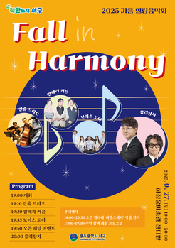 광주시 서구(구청장 김이강)는 오는 27일 오후 7시 농성동 하정웅미술관 앞 잔디광장에서 ‘2025 가을 힐링음악회 – 폴 인 하모니(Fall in Harmony)’를 개최한다.이번 음악회는 ‘공존’을 주제로 음악을 통한 치유와 공감의 장으로 마련됐다. 특히 고액 기부
