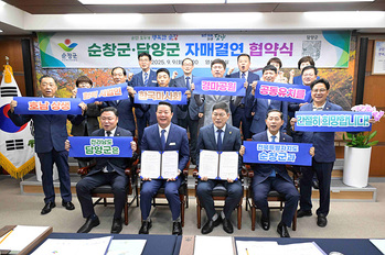 전북 순창군과 전남 담양군은 9일 순창군청에서 자매결연하고 상호 신뢰와 우의를 바탕으로 상생발전을 위한 본격적인 협력에 나서기로 했다.이날 협약식에는 최영일 순창군수, 정철원 담양군수, 손종석 순창군의회의장, 장명영 담양군의회의장을 비롯한 관계자와 민간단체 대표 등 3